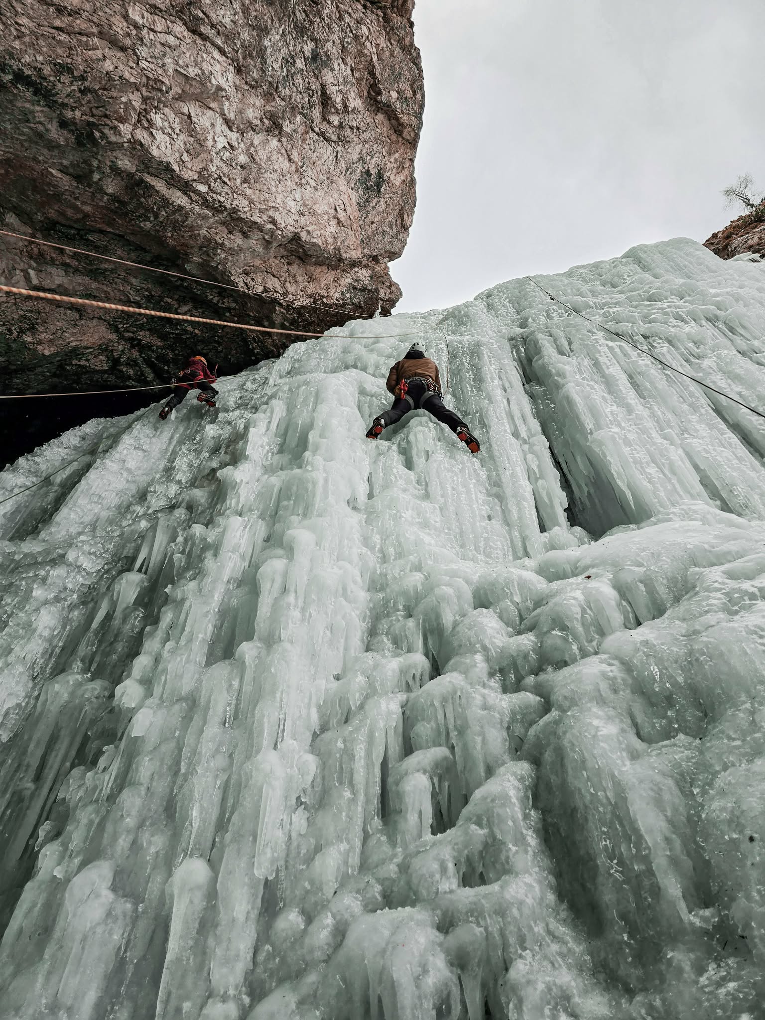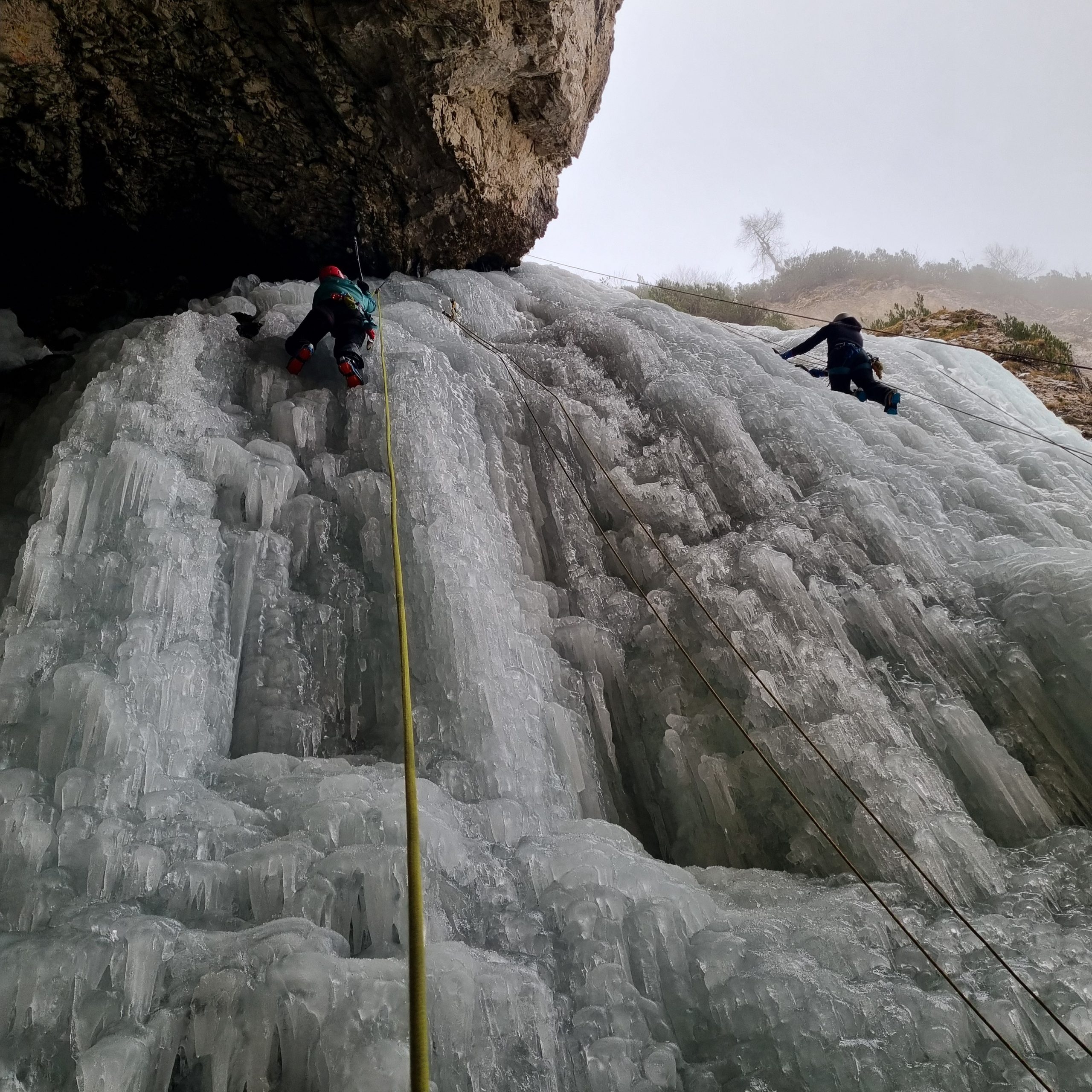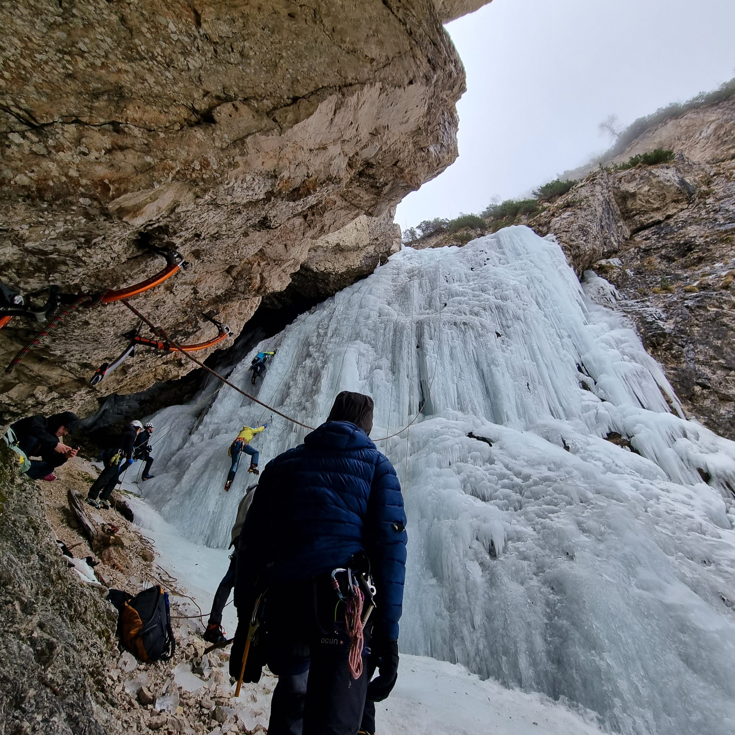 Dan je bil oblačen in za januar precej topel, kar je pomenilo tudi redkejši obisk slapov. V centralnem slapu sta bili dve navezi, zato smo naš poligon postavili pod slapom nad votlino.